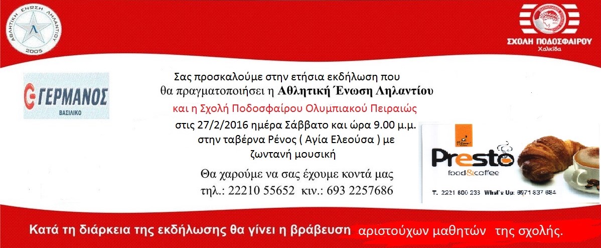 ΣΑΒΒΑΤΟ 27/2 ΕΚΔΗΛΩΣΗ Α.Ε.Λ. ΚΑΙ ΣΧΟΛΗΣ ΠΟΔΟΣΦΑΙΡΟΥ ΣΤΗΝ ΤΑΒΕΡΝΑ ΡΕΝΟΣ ( ΑΓΙΑ ΕΛΕΟΥΣΑ )ΜΕ ΖΩΝΤΑΝΗ ΜΟΥΣΙΚΗ