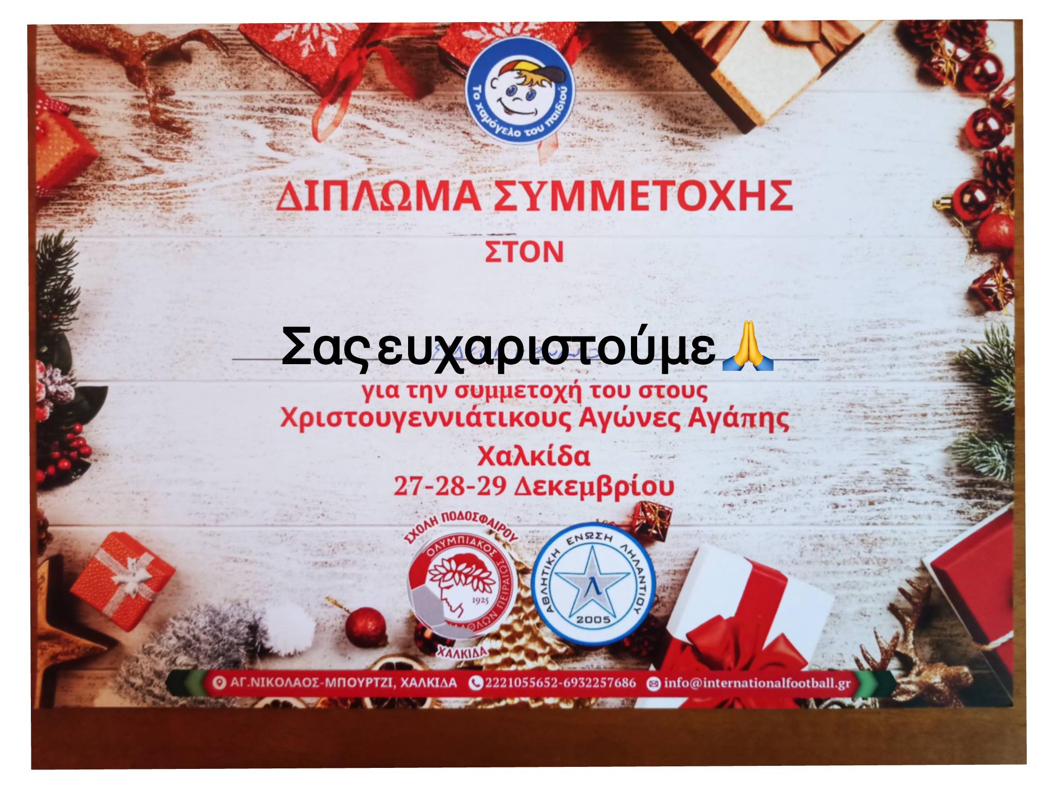 Ένα τουρνουά μια μεγάλη εμπειρία για τη Σχολή μας.  Το τουρνουά αυτό ήταν κάτι πολύ περισσότερο από μια αθλητική διοργάνωση. Ήταν μια εμπειρία ζωής για τους αθλητές μας, τους προπονητές και τους γονείς.  Θέλουμε να δώσουμε θερμά συγχαρητήρια σε όλα τα παιδιά, ανεξαρτήτως αποτελεσμάτων. Μας γέμισαν υπερηφάνεια με τη συμπεριφορά τους, την αγωνιστικότητα και την προσπάθειά τους σε κάθε παιχνίδι. Το ήθος τους μέσα στο γήπεδο, η συνεργασία, ο σεβασμός και... οι μαυρισμένες μουρίτσες στο τέλος των αγώνων, τα λένε όλα.  Προσωπικά, εγώ και ο κ. Τέλης νιώσαμε βαθιά ικανοποίηση βλέποντας αυτή την προσπάθεια. Γνωρίζαμε πόσο απαιτητικοί θα ήταν οι αγώνες και όμως, τα παιδιά στάθηκαν στο ύψος τους με σοβαρότητα, θάρρος και ομαδικό πνεύμα.  Το ίδιο ένιωσαν και οι γονείς που στάθηκαν δίπλα μας – είδαν, κατανόησαν και στήριξαν αυτή την προσπάθεια με όλη τους την καρδιά.  Δεν υπάρχουν λόγια να περιγράψουμε τα συναισθήματα που νιώσαμε όταν το τμήμα Κ10 της Σχολής μας βραβεύτηκε με το Κύπελλο Ήθους, έπειτα από ψηφοφορία της διοργάνωσης, ανάμεσα σε 32 ομάδες από όλη την Ευρώπη. Μια διάκριση που δεν αφορά μόνο την απόδοση, αλλά τις αξίες, τον σεβασμό και τη συμπεριφορά των παιδιών μας – μέσα και έξω από το γήπεδο.  Είμαστε συγκινημένοι και περήφανοι. Αυτή η αναγνώριση ανήκει σε όλους: στους αθλητές μας, στους προπονητές και στους γονείς που είναι πάντα στο πλευρό μας.