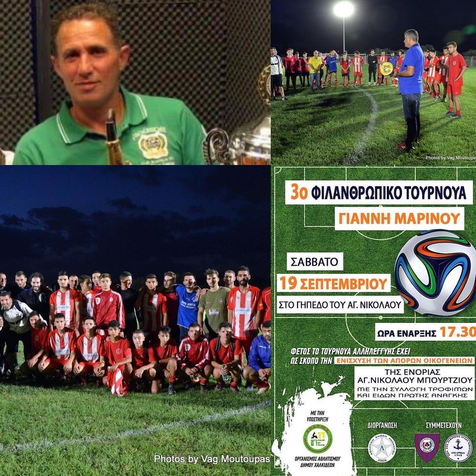 Το Σάββατο 19 Σεπτεμβρίου 2020, στο γήπεδο Αγίου Νικολάουέγινε το 3ο φιλανθρωπικό τουρνουά αφιερωμένο στην μνήμη του Γιάννη Μαρίνου. Ο συνεργάτης φίλος και αδελφός που θα είναι για πάντα στην μνήμη μας. Ευχαριστούμε για την συμμετοχή των ομάδων ΑΕ Προποντίς, ΑΣ Ευβοϊκός Αγίου Νικολάου και Α.Ε Ληλαντίου. Την Πρόεδρο Δ.Ο.Α.Π.ΠΕ.Χ κ. Ελένη Αϊδίνη,την Ε. Π. Σ. Εύβοιας τον Σύνδεσμο Διαιτητών και την νοσηλεύτρια κ.Στέλλα Αργυρού για την βοήθεια τους στην διοργάνωση του τουρνουά. Τέλος όλους τους φίλους και γνωστούς που ήθελαν να είναι παρόντες αλλά δεν γινόταν λόγω μέτρων προστασίας από τον κορονοϊό. Στα πλαίσια του τουρνουά έγινε συλλογή τροφίμων και ειδών πρώτης ανάγκης (θα συνεχιστεί για όλη την εβδομάδα στις εγκαταστάσεις της Σχολής )τα οποία θα δοθούν στην Ενορία Αγίου Νικολάου για να τα διαθέσει σε οικογένειες που έχουν πληγεί από την πλημμύρα του Αυγούστου.